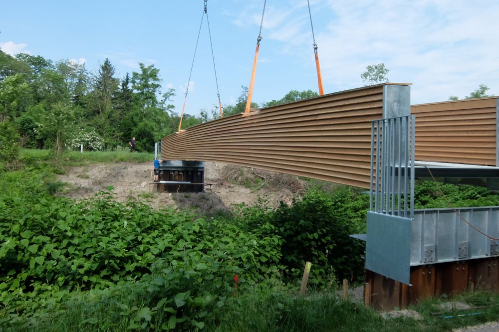 Das Bauvorhaben umfasst die Errichtung einer Fußgängerbrücke mit Fundamenten aus Spundbohlen, einem Tragwerk aus Leimbindern und einem Belag aus Gitterrost.
